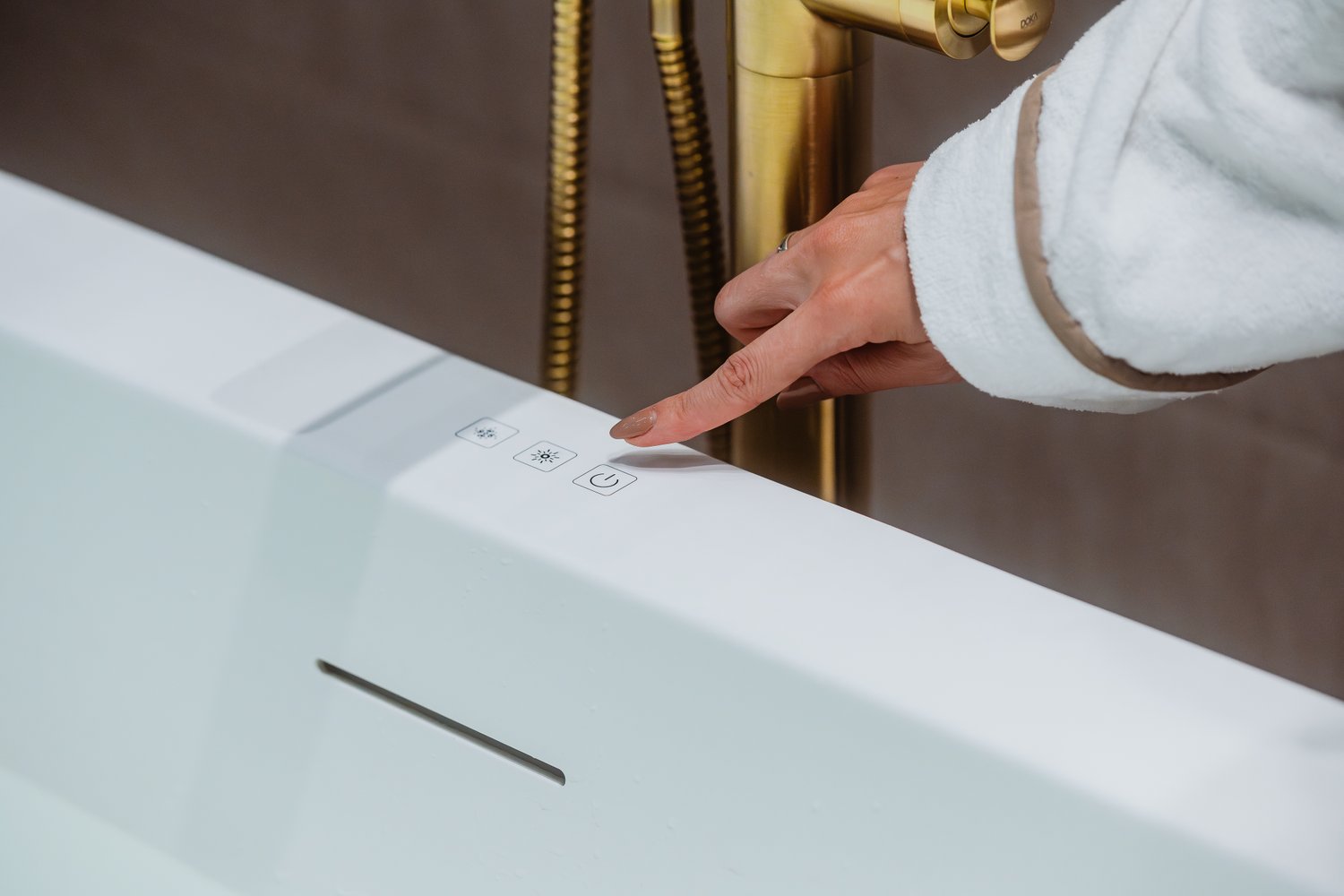 Controle Touch: Teclas embutidas sensíveis ao toque contribuem para o design moderno da banheira, assim como com a facilidade de manuseio e utilização da mesma.