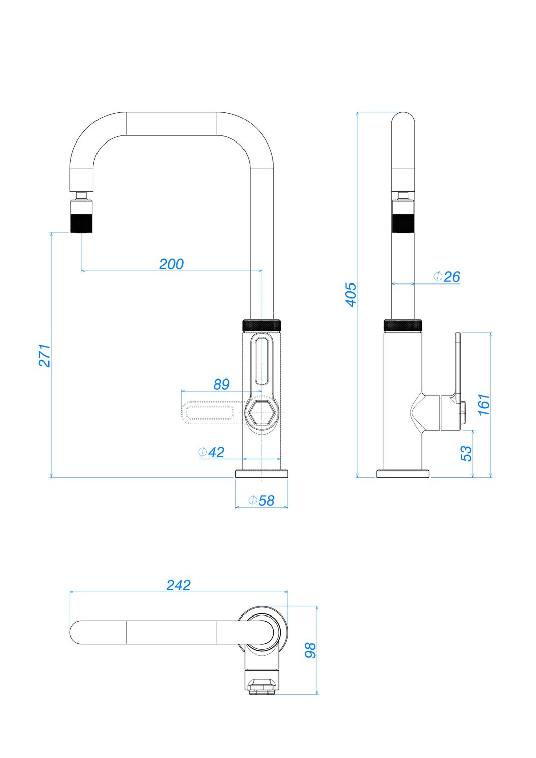 - Bica móvel, permite o direcionamento do fluxo de água. Maior conforto e maior funcionalidade ao produto (na cozinha permite a utilização de cuba dupla